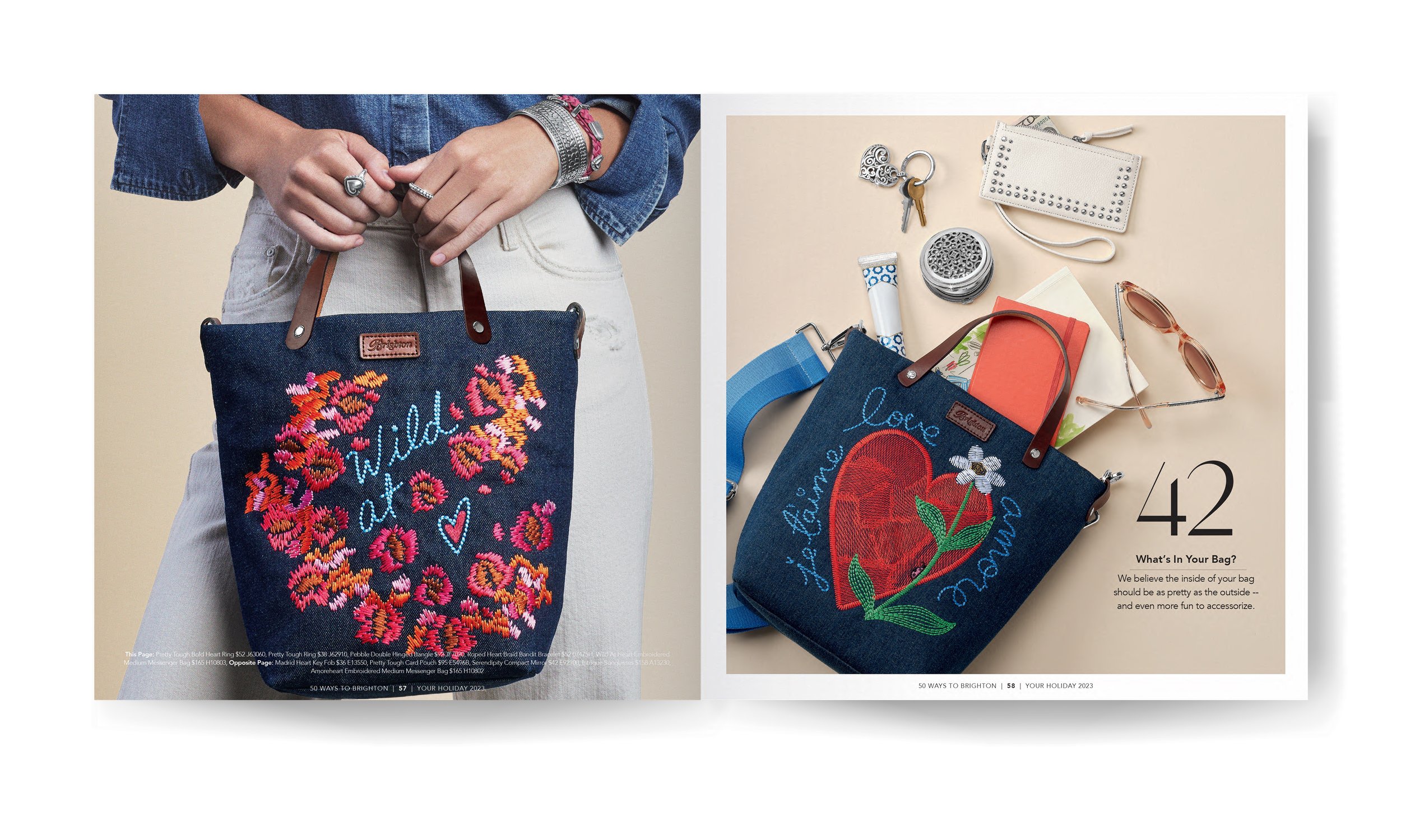 "50 Ways to Brighton Your Holiday" is a festive holiday publication distributed to both wholesale representatives and retail customers. This publication highlights the top 50 gifts from Brighton across various categories including jewelry, footwear, handbags, belts, sunglasses, home decor, and other small leather goods.